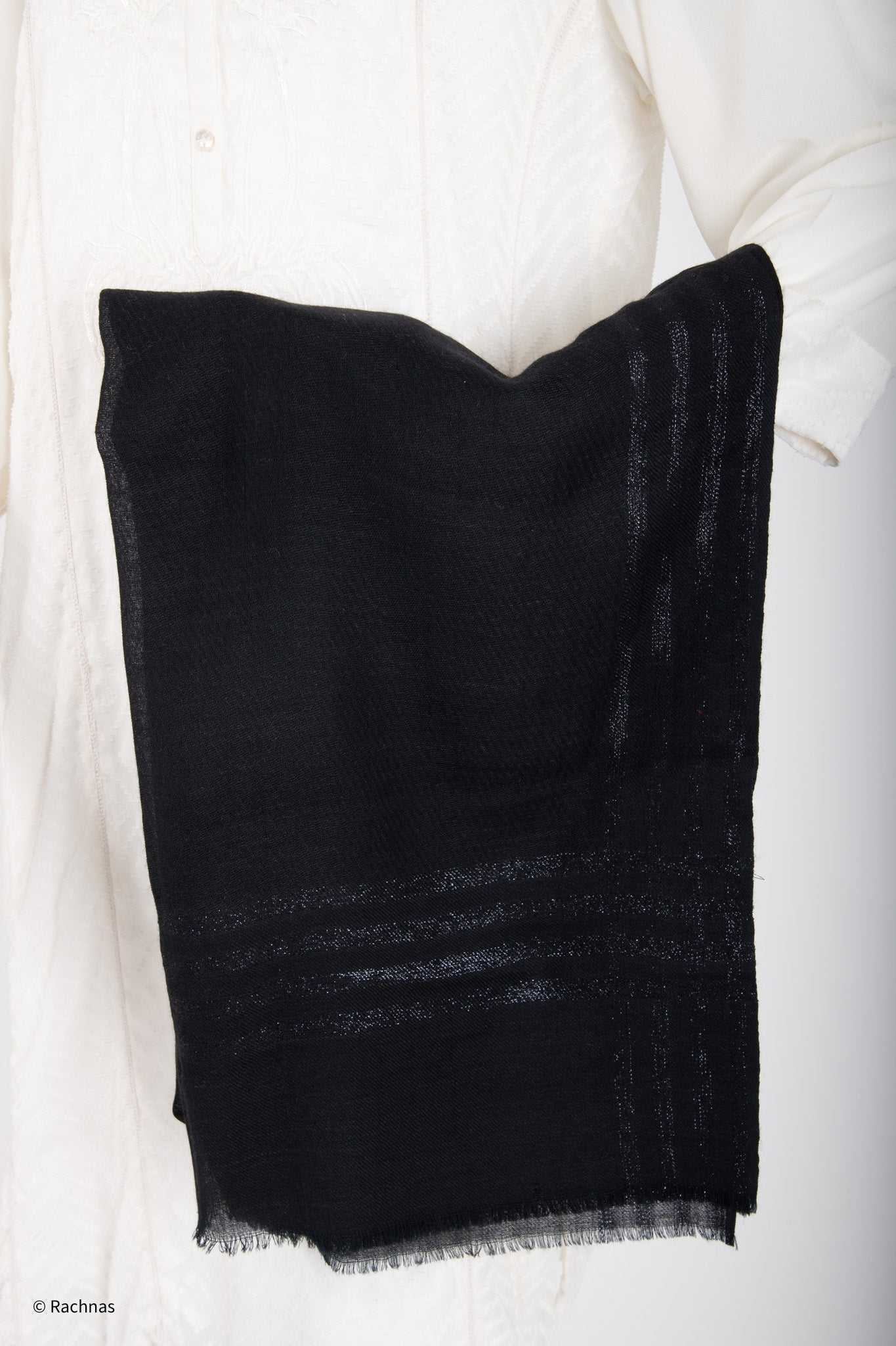 The hallmark of this shawl lies in its stunning Zari border, meticulously woven with metallic threads of gold or silver, adding a touch of opulence and sophistication to the piece.