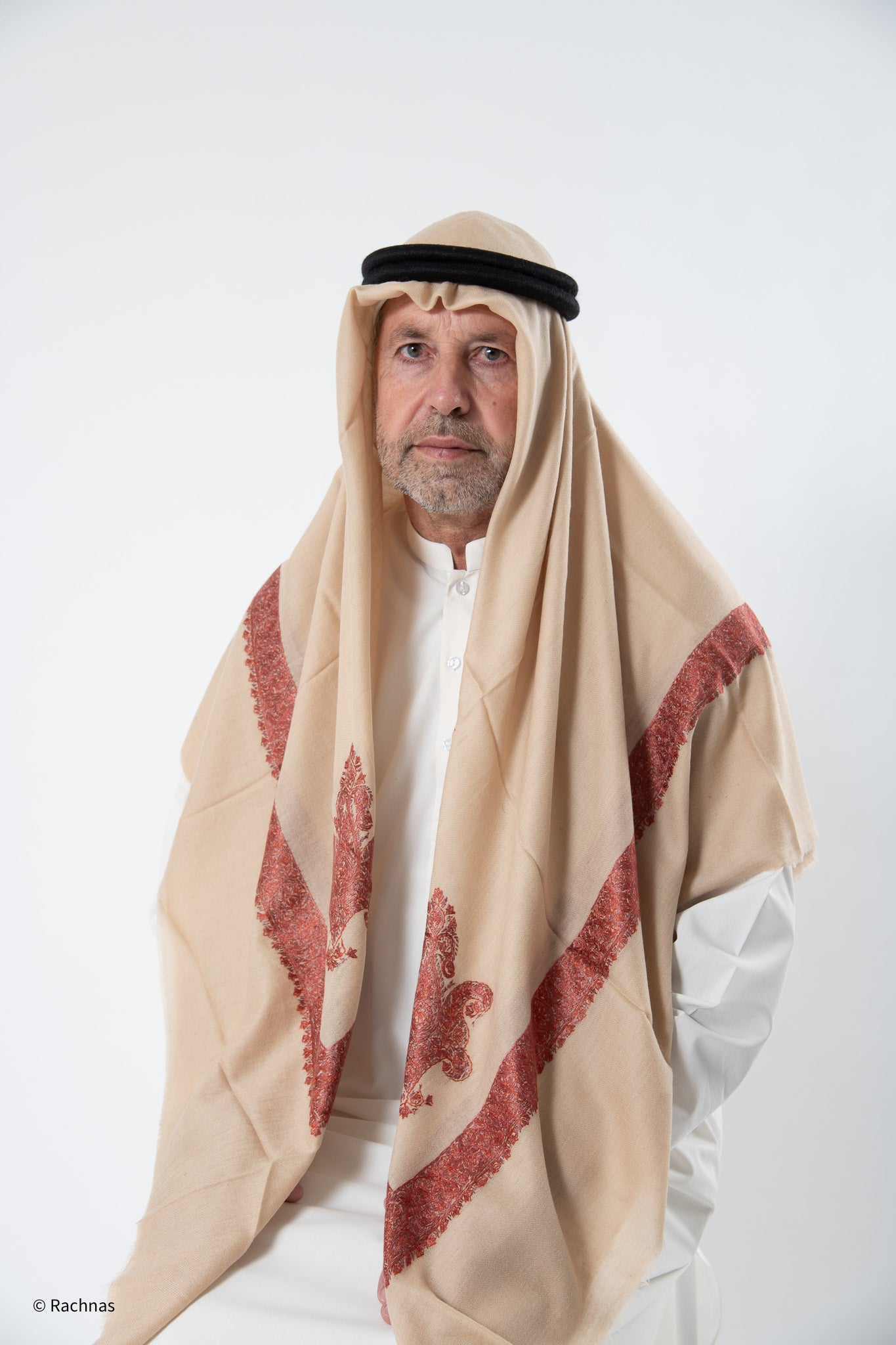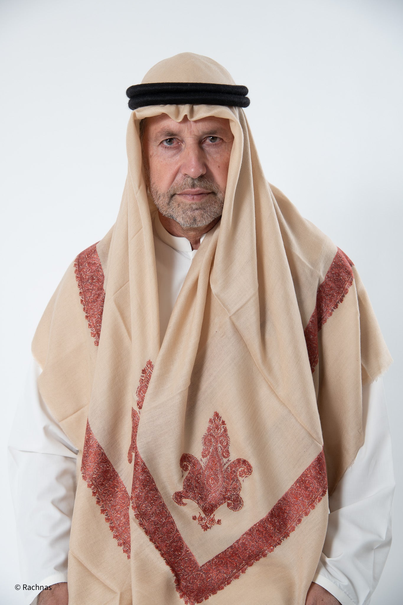 Our luxurious 100% Cashmere Ghutra, crafted with exquisite hand embroidered motifs and border that redefines understated elegance.