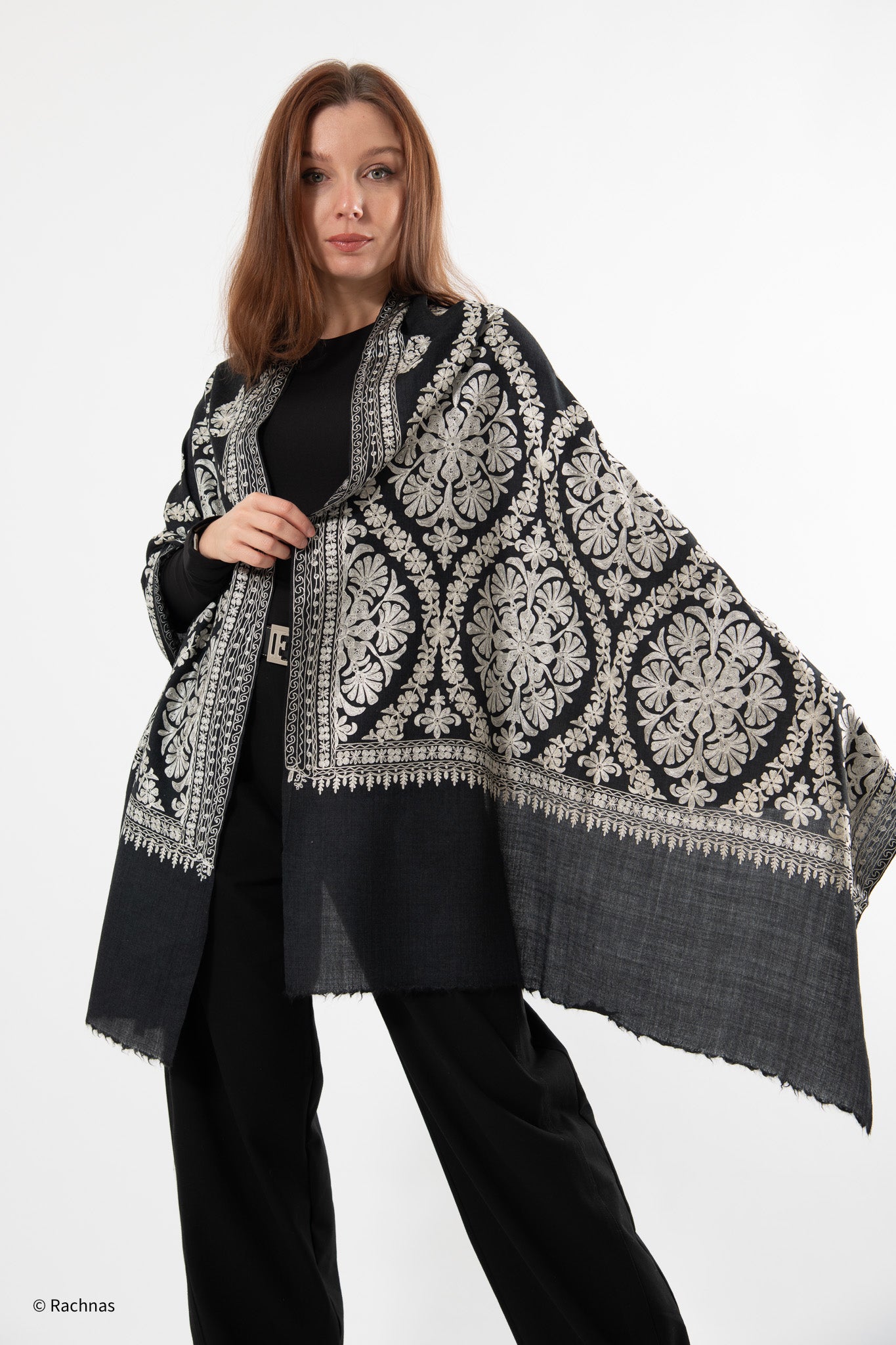 Crafted from 100% cashmere, each shawl is a work of art. This exquisite fabric is carefully sourced and expertly sewn by skilled artisans from Kashmir, India utilizing a combination of traditional techniques, artistic skill, and attention to detail, resulting in a timeless and luxurious piece of wearable art
