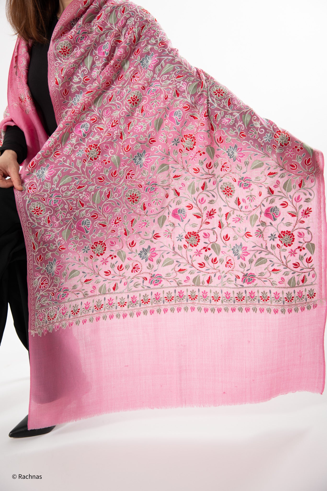 Crafted from 100% cashmere, each shawl is a work of art. This exquisite fabric is carefully sourced and expertly sewn by skilled artisans from Kashmir, India utilizing a combination of traditional techniques, artistic skill, and attention to detail, resulting in a timeless and luxurious piece of wearable art