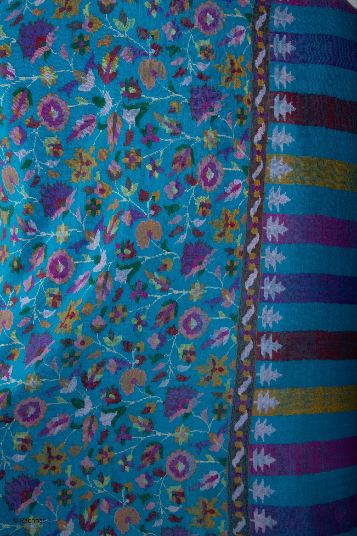 What sets this shawl apart is its exquisite Kani embroidery, covering the entirety of the fabric. Each intricate motif is meticulously embroidered by skilled Kashmiri artisans, using traditional Kani techniques that have been passed down through generations.