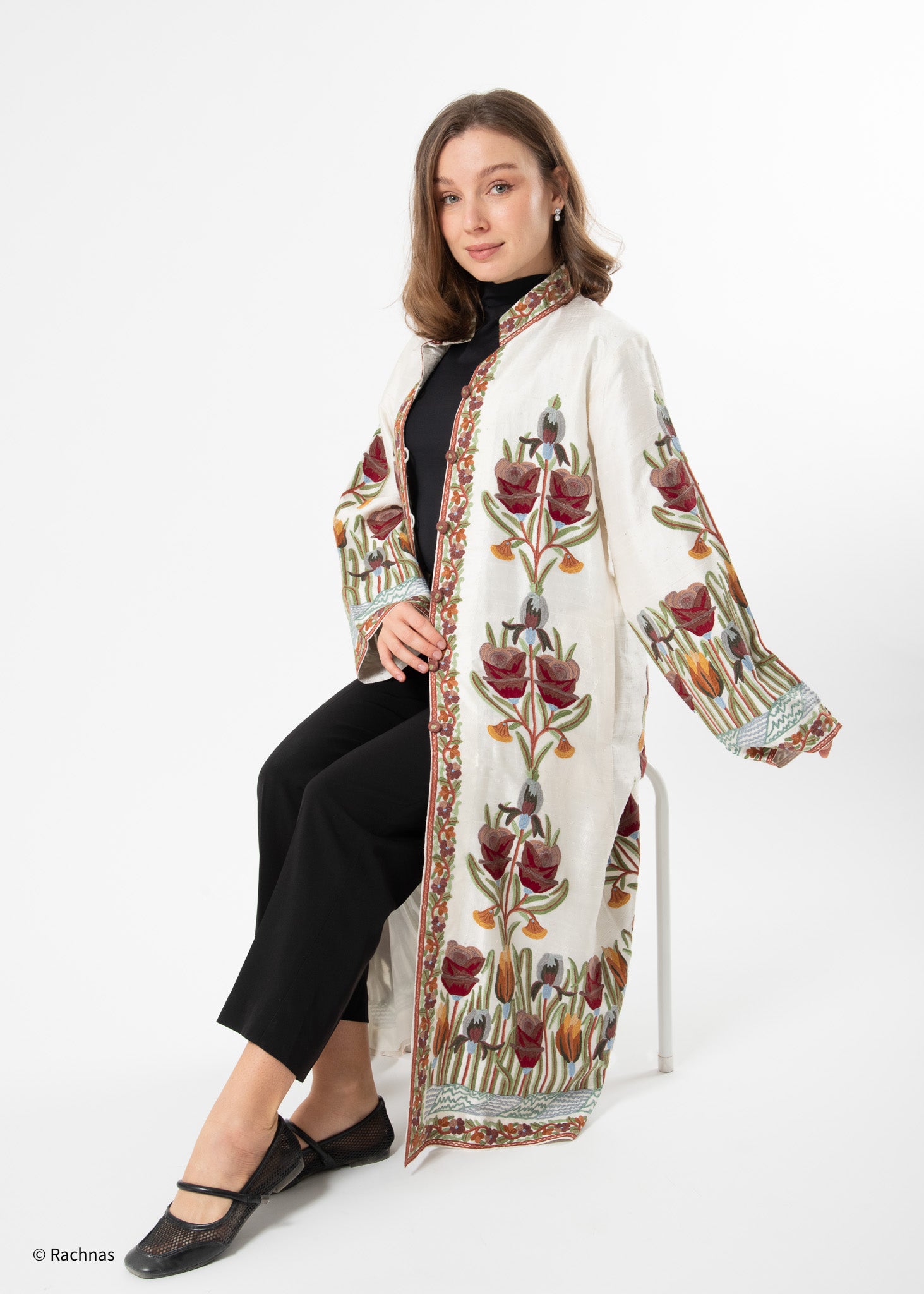 Our elegant 100% Silk Long Coat, adorned with intricate Kashmiri embroidery that graces the garment from edge to edge.